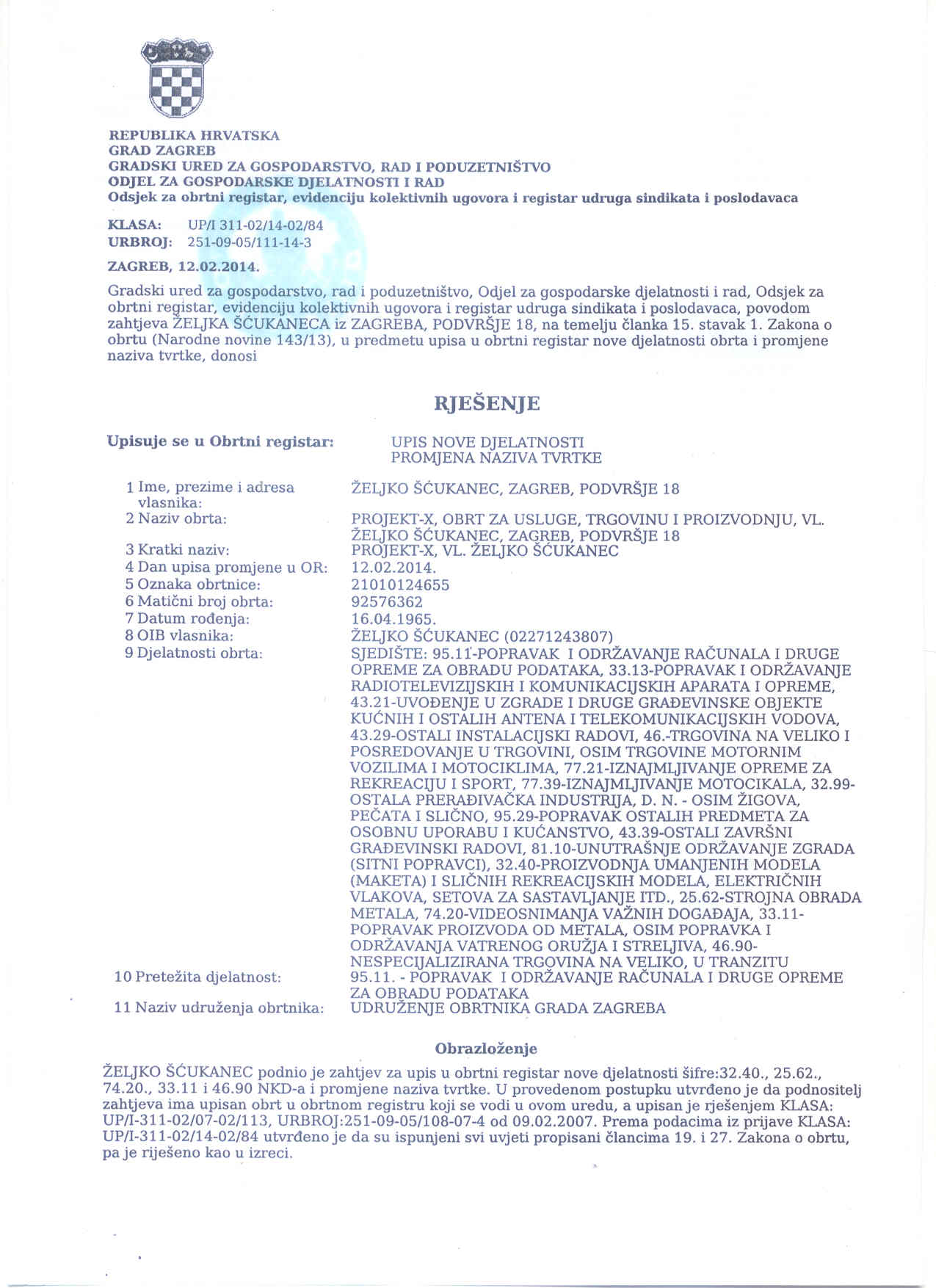 Djelatnosti (OBRTNICA br. 21010124655 - M.B. 92576362 - OIB 02271243807) za koje smo registrirani su: